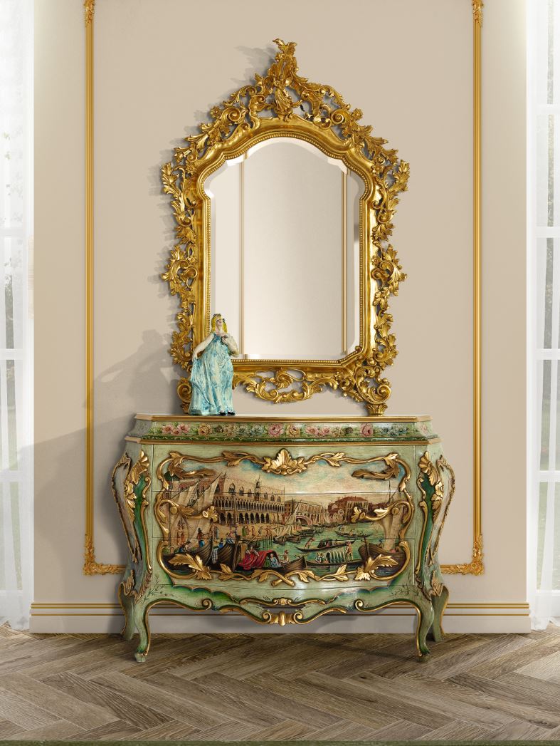 La camera fornisce un'atmosfera artistica con tocchi classici e opulenti. Questi mobili con un decor senza tempo sono realizzati in tiglio massello e decorati con intagli e dipinti fatti a mano, dorati con foglia oro zecchino a 24 carati.